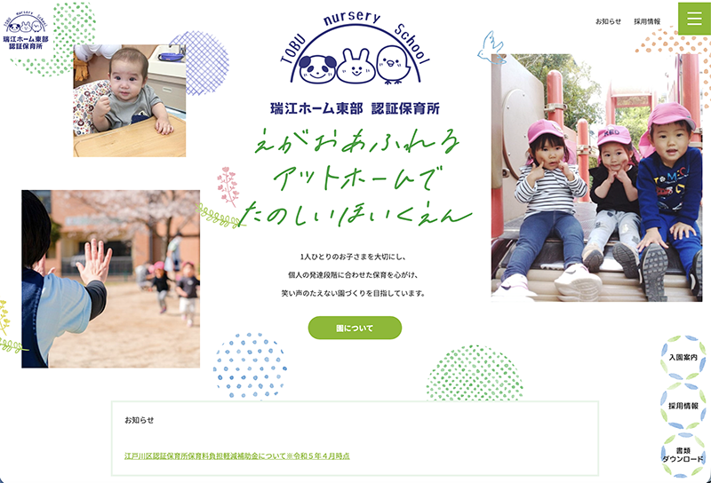 「えん保育デザイン」では、ホームページ制作を軸に、電話不要の「見学予約」や「求人エントリー」の導線をまるごと構築。
