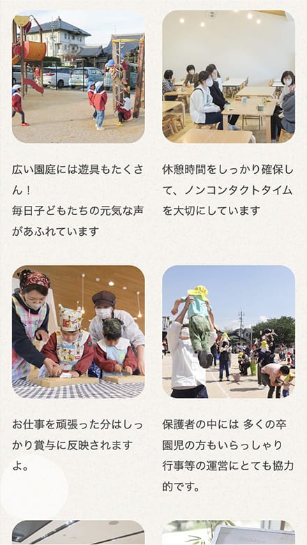- 「〇〇市 幼稚園」と検索された時に上位に表示される設定や、魅力的な写真の掲載を代行します(1,2)。
